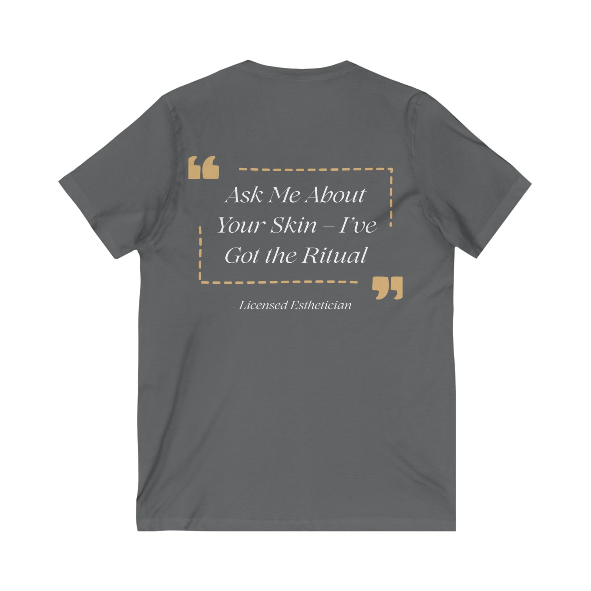 Introducing the perfect Unisex Jersey Short Sleeve V-Neck Tee — a stylish addition to any wardrobe. This tee effortlessly combines comfort and sophistication, making it ideal for both casual hangouts and semi-formal gatherings. Crafted from lightweight, breathable cotton, it features a flattering V-neck designed to enhance your silhouette while providing ease of movement. Perfect for skincare enthusiasts or those in the beauty profession, this tee serves as a great conversation starter, especially for events like skincare workshops, beauty expos, or daily wear. Show off a trendy yet approachable vibe, making it a great gift for holidays like birthdays, Mother's Day, or as a thoughtful present for friends celebrating achievements in the beauty industry. Embrace a relaxed, confident atmosphere wherever you go with this essential piece!